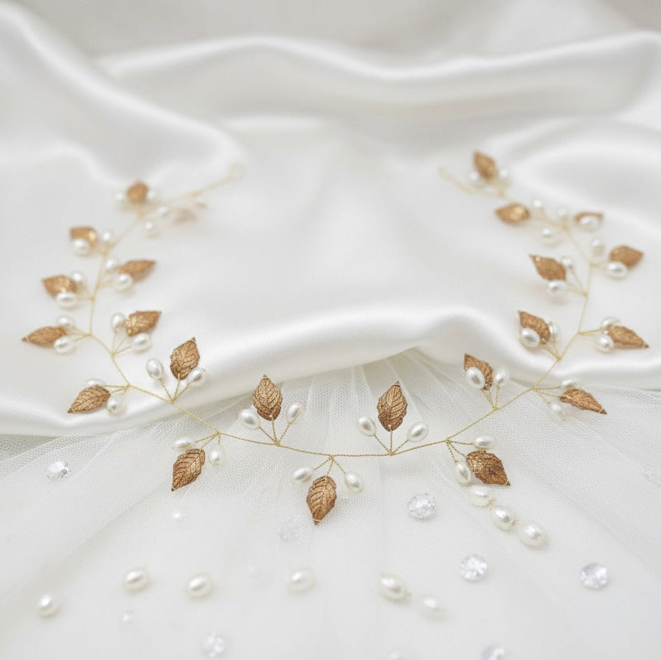 - Elaborado con perlas y apliques de hojas.